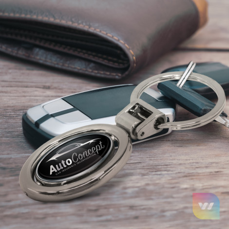Oval metal key ring with a plated shiny chrome finish and an inner part that spins. The inner spinning part is branded on both sides with a resin coated finish and it is nicely presented in a black gift box.