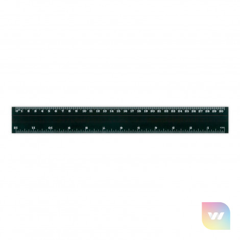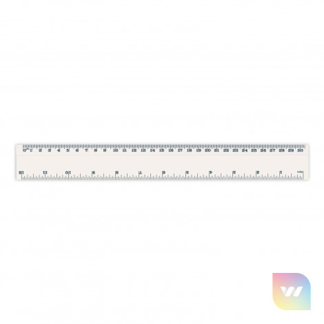 Plastic 30cm ruler with graduations in both centimetres and inches. It has a recessed bottom edge that flips the ruler up when pushed so it is easily picked up from a flat surface.