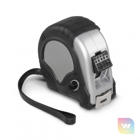 Locking tape measure with a tough impact-resistant rubber outer case and a 5m metal tape featuring both inches and centimetres. It also has a belt clip and a wrist strap.