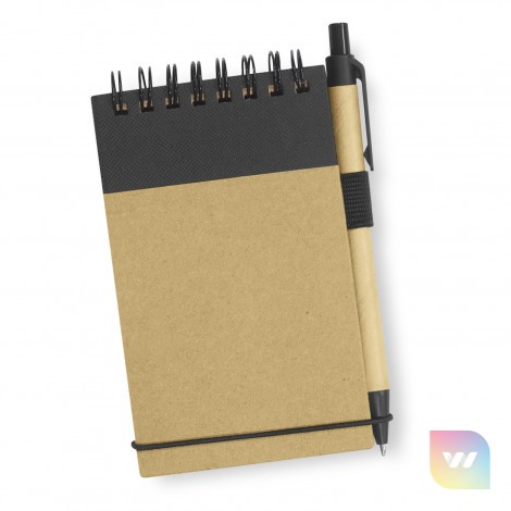 Top opening wiro bound pocket note pad (approximately A6) with 50 leaves of lined paper. It has an elastic closure band, an elastic pen loop and a pen. The barrel of the pen is made of paper, and the plastic parts of the pen contain cornstarch material to reduce the amount of plastic used.