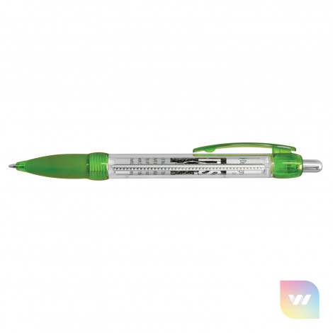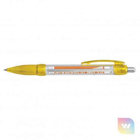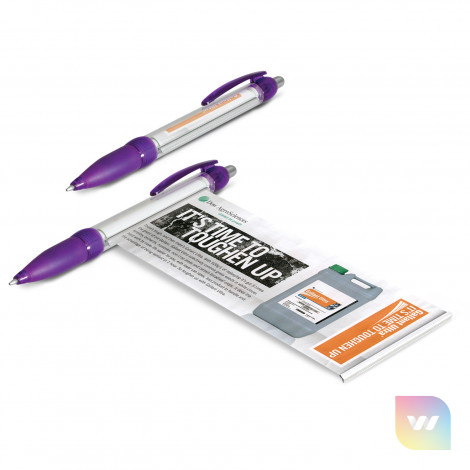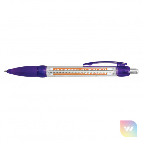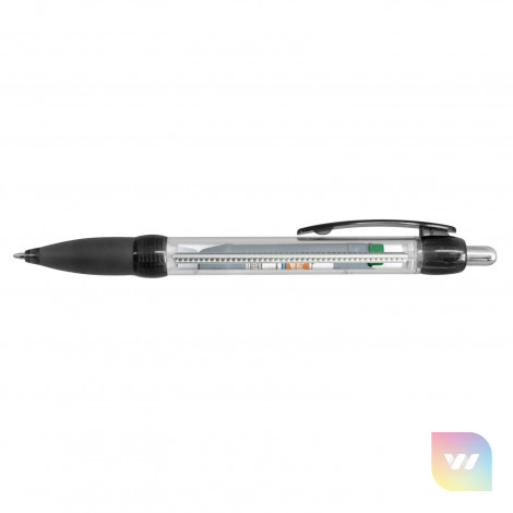 Retractable plastic ballpoint pen with a spring-loaded banner which can be branded in full colour on both sides. The pen has a soft rubber grip, translucent trim, and 1200m of German manufactured Dokumental ink. The refill is available in blue or black ink. A production lead time of 40 working days applies to this product by air freight and larger orders can be sea freighted on request to reduce the freight cost.
