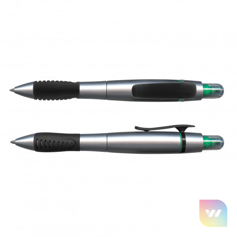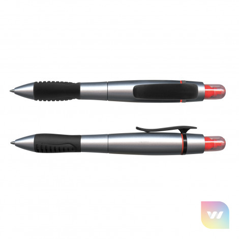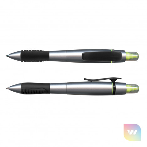 Twist action multi-function ballpoint pen with a metallic silver barrel, a soft rubber grip and a highlighter. It has a blue refill with 500 metres of German manufactured Dokumental ink and can be presented in an optional pen sleeve.