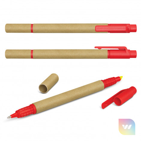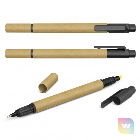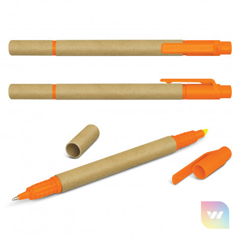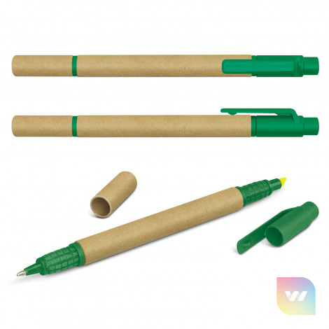 Ballpoint pen with a recycled cardboard barrel and a yellow highlighter. It has a blue refill with 700 metres of German manufactured Dokumental ink and it can be presented in an optional pen sleeve.