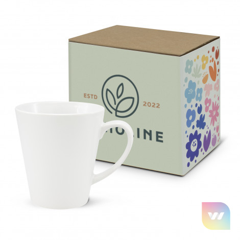 Latte style 300ml stoneware coffee mug that is manufactured for spot colour or full colour wraparound branding and is presented in a natural gift box. This product is not dishwasher safe and handwashing is recommended.
