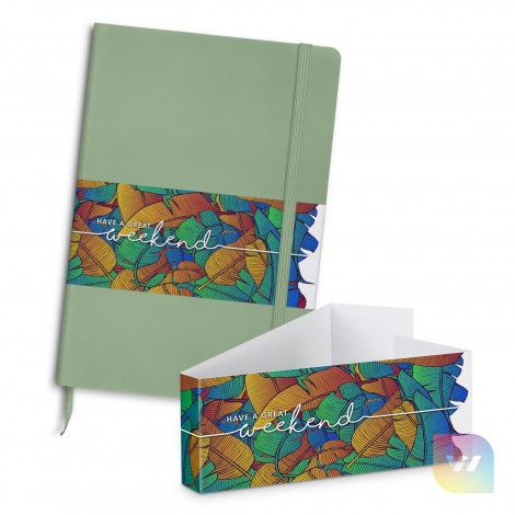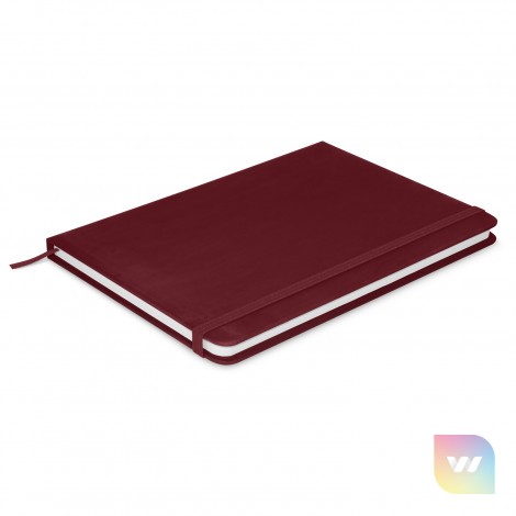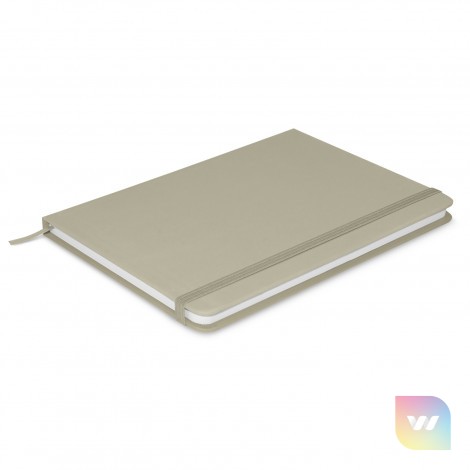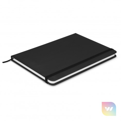 Smart medium-size (approximately A5) notebook with 80 leaves (160 pages) of 70gsm lined white paper and a hard cover PU cover. It has an elastic closure band and a bookmark ribbon. An optional paper belly band is available on request and can be branded in full colour.