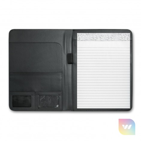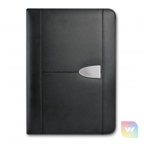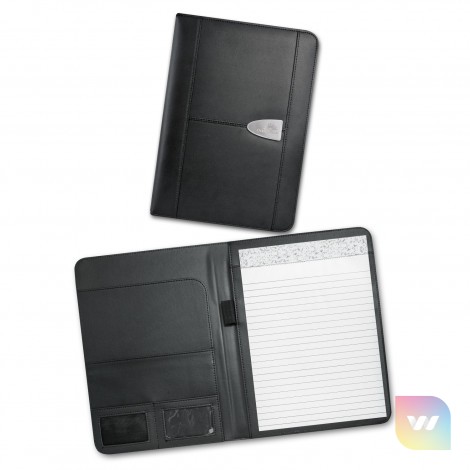 Superior large portfolio with a superb bonded leather cover. It has a lined A4 pad, a business card pocket and a pen loop. Sovrano has a unique metal centre plate which can be branded with the choice of a resin coated finish or a metal insert that laser engraves to a stainless steel finish. It can also be laser engraved directly onto the portfolio and can include individual names for an additional charge. The portfolio surface laser engraves to a matt brown finish.