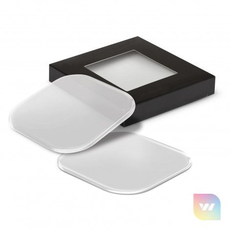 Set of four plastic coasters neatly presented in a smart cardboard sleeve. Branding is on the underside of the coaster.