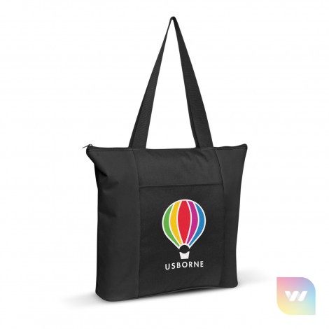 Refined tote bag with a rounded gusset and a sewn in base for added capacity. It is manufactured from tough 600D polyester and has a slip front pocket, a secure zippered top closure and long woven carry handles so it can be comfortably carried on a shoulder.