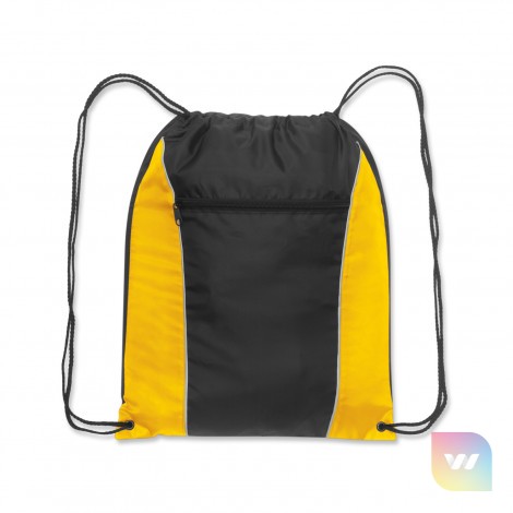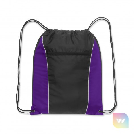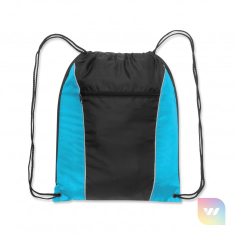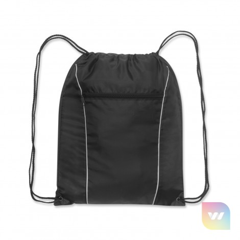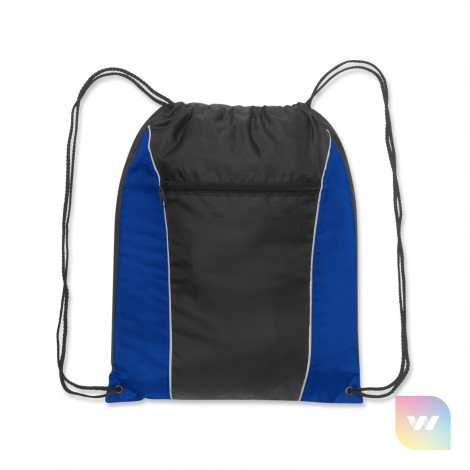 Premium drawstring backpack with a large zippered front pocket. It is manufactured from 210D polyester and has reinforced eyelets at the base for added strength.