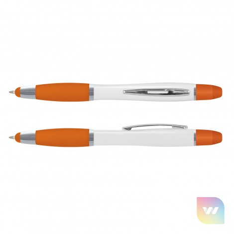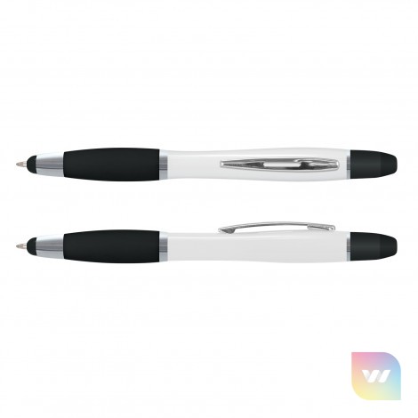 Twist-action plastic ballpoint pen with a white barrel, a soft-touch grip and shiny chrome trim. It has a stylus for use with touch screens and a yellow wax highlighter which will never dry up. Vistro has a black refill with 600 metres of German manufactured Dokumental ink and can be presented in an optional pen sleeve.