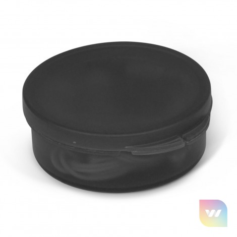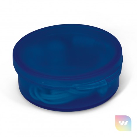 Set of earbuds in a convenient pocket-size plastic carry case. Branding is on the carry case.