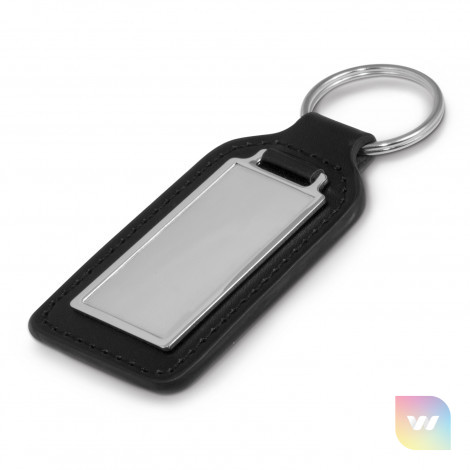 Genuine leather key ring with a rectangular metal plate for branding in spot colour or full colour with a resin coated finish. Baron is nicely presented in a black gift box.