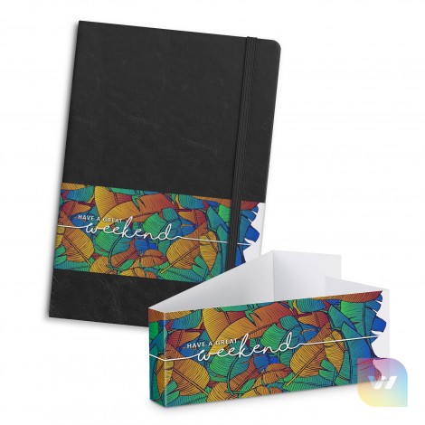 Refined medium-size (approximately A5) notebook with 80 leaves (160 pages) of 80gsm lined cream paper, an elastic closure band and a unique pen holder on the inside of the spine. It has a hard cover with a textured PU finish and a stylish aluminium Lancer Pen is included in the pen holder. An optional paper belly band is available on request and can be branded in full colour.