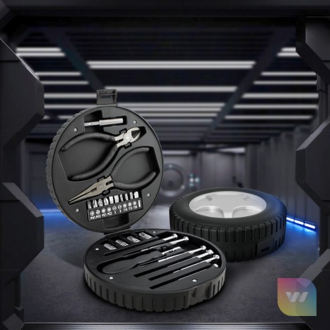 Sturdy 24-piece tool set in a novel wheel-shaped plastic case.