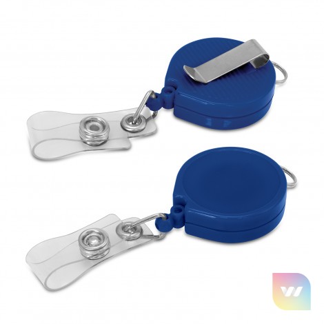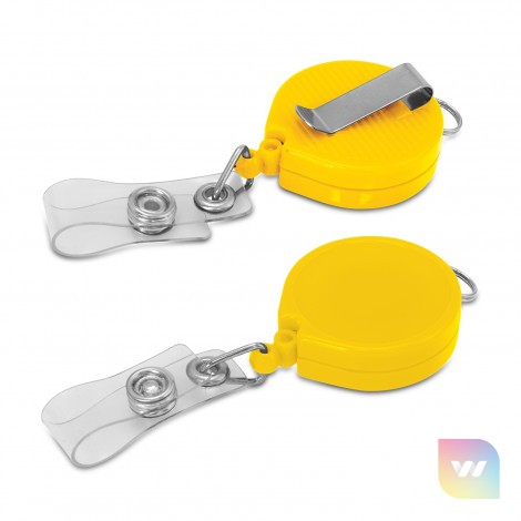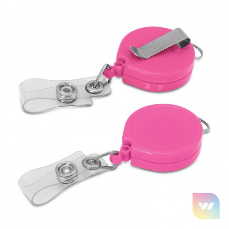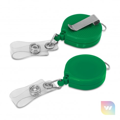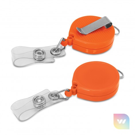 Retractable ID holder with a reliable steel spring and a standard dome attachment for holding plastic ID card holders. It has a pocket clip on the reverse and a split ring on the top for attaching it to a lanyard. Lanyards and clear vinyl ID holders are available on request.