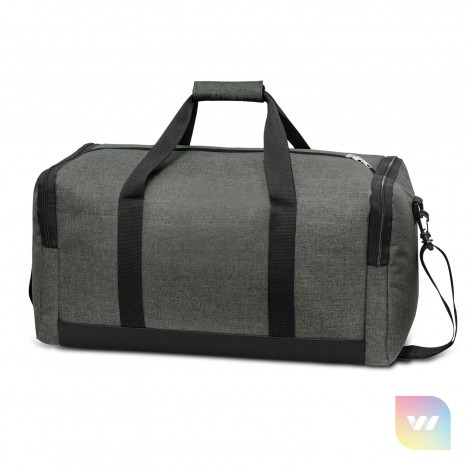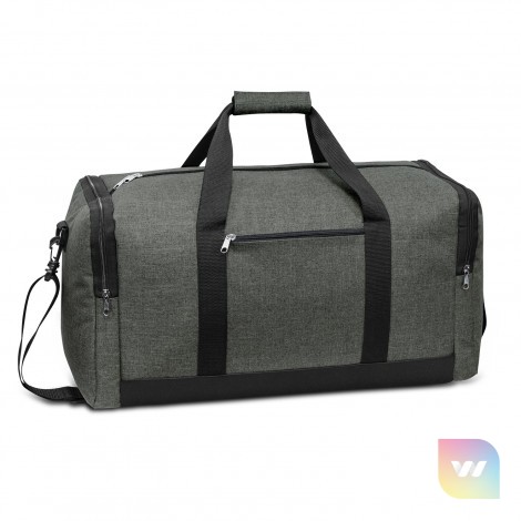 Carry on size duffle bag which is manufactured from poly-canvas with an on-trend heather style finish. It has woven carry handles with a Velcro cuff and an adjustable woven shoulder strap which is removable. Other features include two zippered end pockets, a zippered side pocket and a tough 600D polyester base.