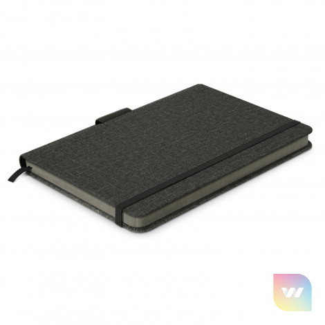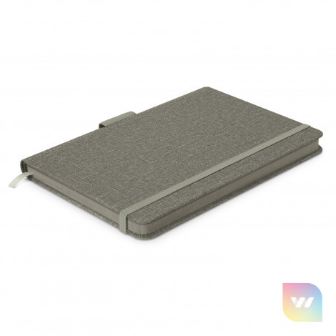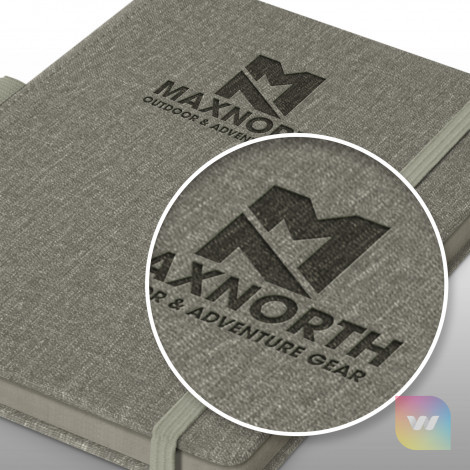 Exceptional medium-size (approximately A5) notebook with 96 leaves (192 pages) of 80gsm lined cream paper. It has a hard cover that is finished with textured, heather style PU which gives it a trendy woven look. Other features include colour-edged pages, a bookmark ribbon, an elastic closure band and an elastic pen loop on the spine. Meridian thermo debosses to a stunning two-tone finish.