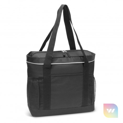 Large 26L cooler tote bag with PE foam insulation encased in a water-resistant PEVA inner liner and a secure zippered top opening. The outer construction is robust 600D polyester with decorative ripstop nylon and smart white piping around the top. It has one large slip pocket and two mesh pockets on the front. Zero has extra wide woven handles that allow it to be carried by hand or on a shoulder.