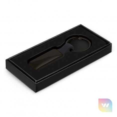 Opulent silicone and metal key ring with a gunmetal plated finish on both sides which can be laser engraved to a natural etch. It is beautifully presented in a black gift box.