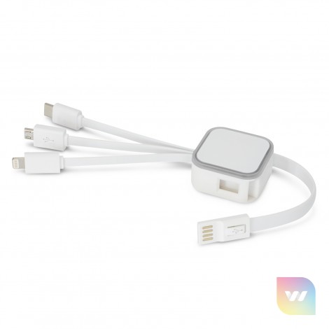 A handy mobile charging cable for phones, tablets, cameras, GPS etc. It offers four different connectors in one compact unit which lights up when it is being used. Cypher has a USB connector cable which snaps into the housing when not in use to make a handy loop for securing it to bags and key rings. The other three cables feature a Micro-B connector, a Lightning connector and a USB Type-C connector. This device is for charging only and is not designed for data connections.