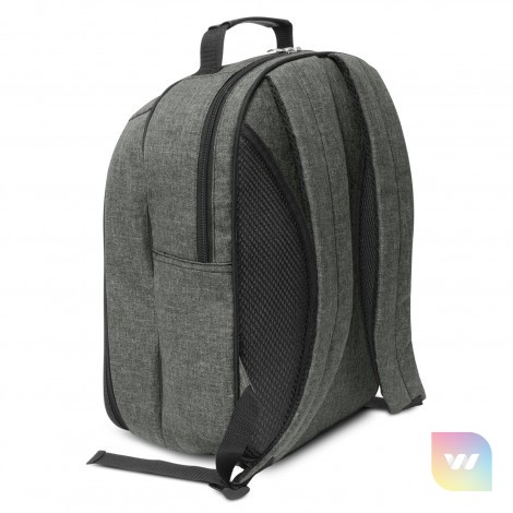 Superb four person picnic backpack which is manufactured from poly-canvas that has an on-trend heather style fabric finish. It has a large zippered cooler compartment at the front which is lined with thick PE foam insulation encased in a water-resistant PEVA inner liner. The rear compartment has a zip around closure that allows it to open out to 90 degrees revealing plates, cutlery, napkins and glasses for four people. There is also a wine waiter's knife and salt and pepper shakers. Other features include an external zippered pocket on the back, a padded front for comfortable carrying, adjustable shoulder straps and a carry handle.
