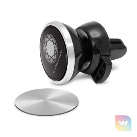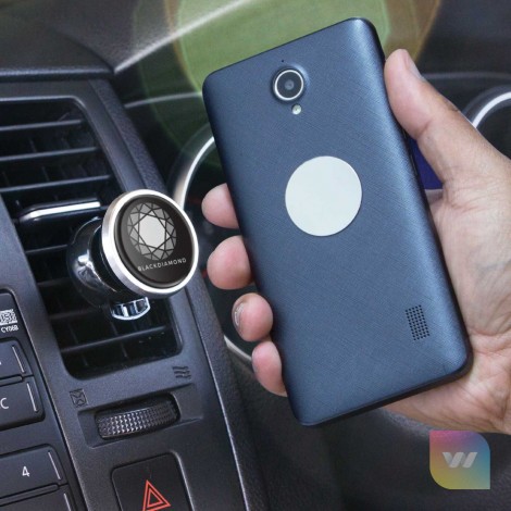 Magnetic phone holder that attaches securely to a car air vent with a spring-loaded clip to enable the phone to be used as a GPS. To establish the magnetic connection, the thin metal plate (included) is attached to the phone or phone case with strong 3M adhesive that wont leave marks if it is removed. The metal plate attachment is a proven concept and will not damage or affect the performance of the phone.