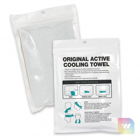 Polyester cooling towel which can also be used as a handy sports or gym towel. It will cool up to 15 degrees below the outdoor temperature in seconds when wet. Simply wet, wring out and snap tight to remove the excess water. Cooling will last as long as the towel remains wet and it is a natural, chemical free reaction. The fabric is constructed to maximise the cooling power of rapid evaporation and the towel is worn around the neck or head to stay cooler for longer. Active is ideal for use when playing sports, jogging, walking, biking, at the gym, working outdoors etc. It is presented in a re-sealable storage pouch or an optional carabineer tube, both of which include full instructions.