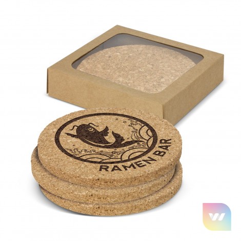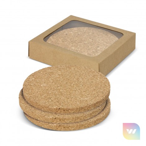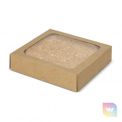Set of four stylish natural cork coasters that provide protection from heat and spills. When cork is harvested only the outer bark is removed from the tree. This allows the tree to continue growing and replenishing the bark. It also has the benefit of a comfortable soft-touch texture while being very durable. This set is nicely presented in a natural cardboard gift box with a window to show off the brand.