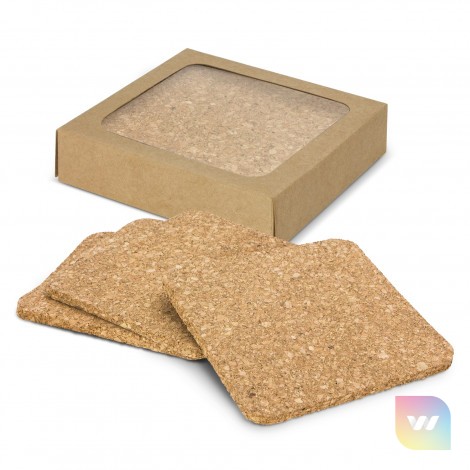 Set of four stylish natural cork coasters that provide protection from heat and spills. When cork is harvested only the outer bark is removed from the tree. This allows the tree to continue growing and replenishing the bark. It also has the benefit of a comfortable soft-touch texture while being very durable. This set is nicely presented in a natural cardboard gift box with a window to show off the brand.