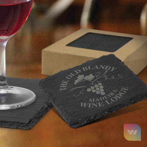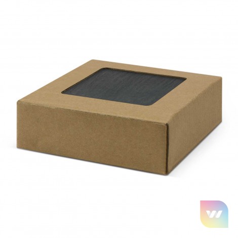 Deluxe natural slate coasters that have four soft non-slip and non-marking polyurethane pads on the base. The set is nicely presented in a natural unbleached cardboard gift box with a window to show off the brand.