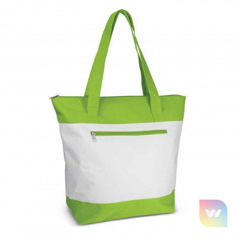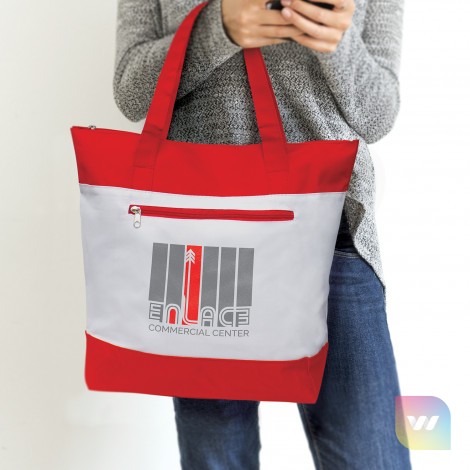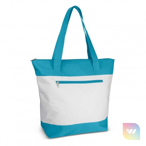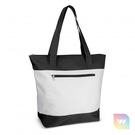 Smart two-tone tote bag with a rounded gusset and a sewn in base for added capacity. It is manufactured from tough 600D polyester and has a zippered front pocket, a secure zippered top closure and long woven carry handles so it can be comfortably carried on a shoulder.