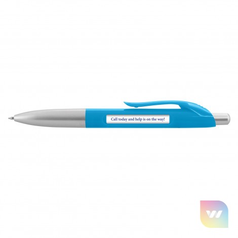 Retractable plastic ballpoint pen with a soft rubber grip, metallic trim and a rotating inner barrel which holds six different messages. Each time the push button is clicked, a new message is displayed in the clear barrel window. It has a blue or black refill with 1200 metres of German manufactured Dokumental ink.