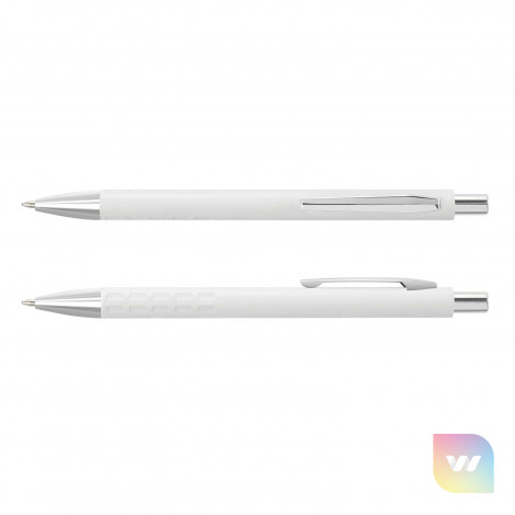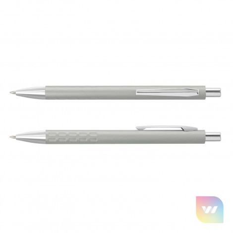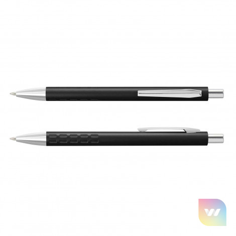 Retractable aluminium ballpoint pen with a debossed pattern on the grip, a matte lacquered barrel and shiny chrome accents. It has a blue large volume refill with 800 metres of writing ink and can be presented in an optional black pen sleeve.