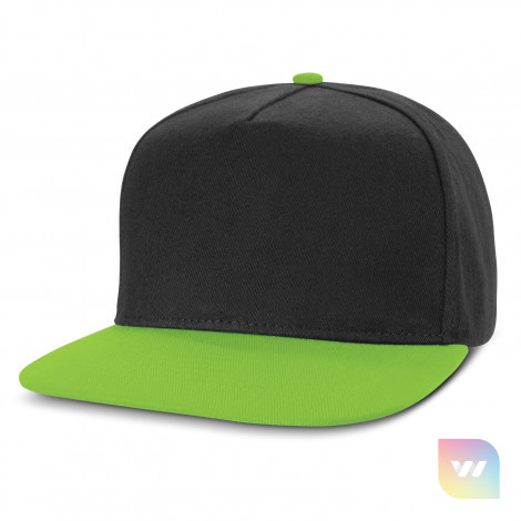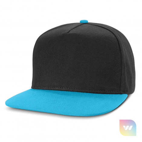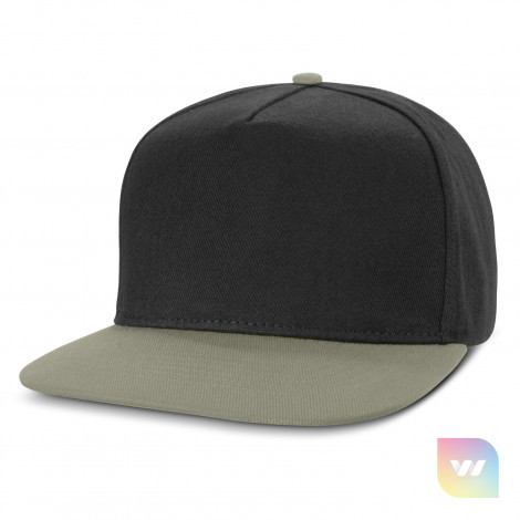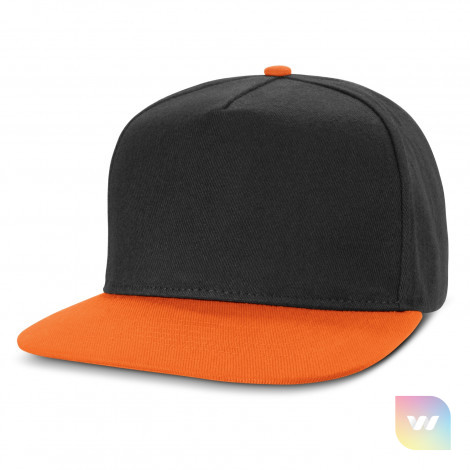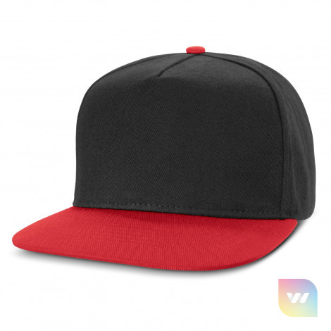 Premium structured five panel cap which is made from cotton twill. It has a flat peak, embroidered eyelets, a sweatband and an adjustable snap back closure that allows one size to fit most people.