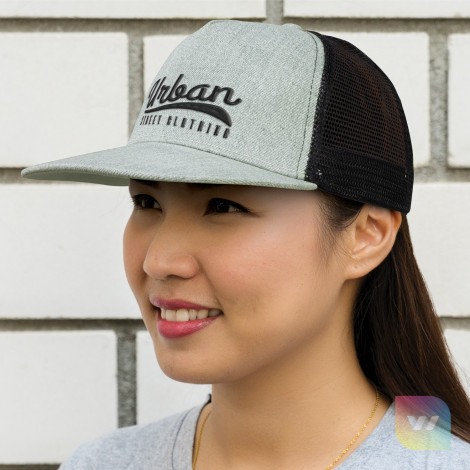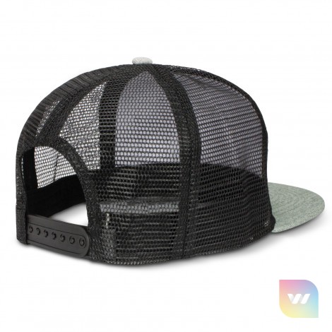 Premium structured five panel cap which is made from polyester with a trucker style breathable mesh back. It has a flat peak with a matching button. Other features include a sweatband and an adjustable snap back closure that allows one size to fit most people.