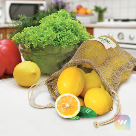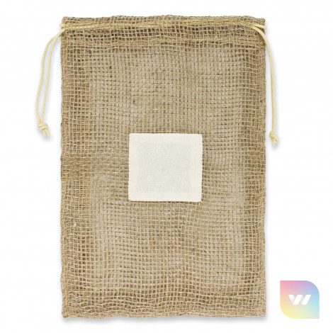 This unbleached jute net produce bag can be reused many times. It is designed for transporting fruit and vegetables while allowing them to breathe so they arrive home in the best possible condition. It has a drawstring closure and an unbleached cotton patch for branding.