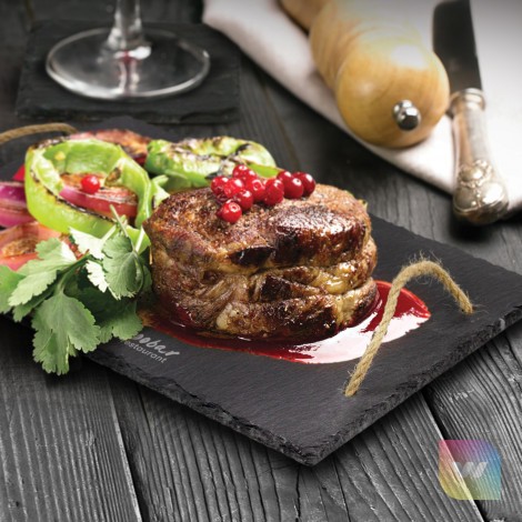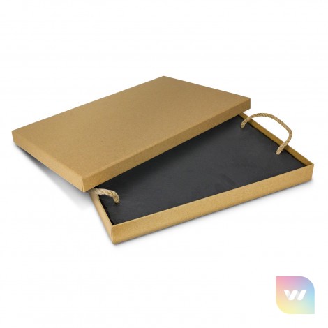 Deluxe natural slate serving board with four soft non-slip and non-marking polyurethane pads on the base. It has natural hemp rope handles and is beautifully presented in an unbleached cardboard gift box.