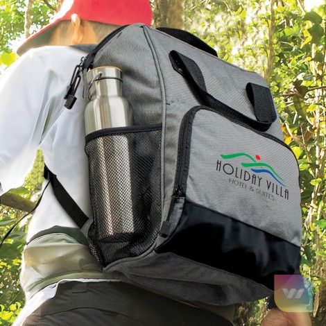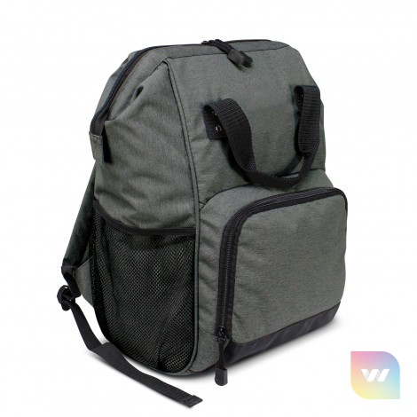 Large 19L backpack cooler bag with thick PE foam insulation encased in a water-resistant PEVA inner liner. The outer construction is heather style poly-canvas with a large zippered front pocket and two side pockets, one of which is mesh. Other features include adjustable padded shoulder straps, a zippered top closure, a woven carry handle and smart zipper pulls.