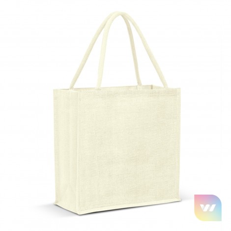 Classic laminated jute tote bag with a large gusset and padded cotton handles. The bag and handles have been dyed to match.