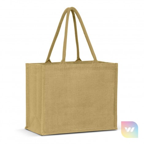 Extra-wide laminated jute tote bag with a large gusset and padded cotton handles. The bag and handles have been dyed to match.