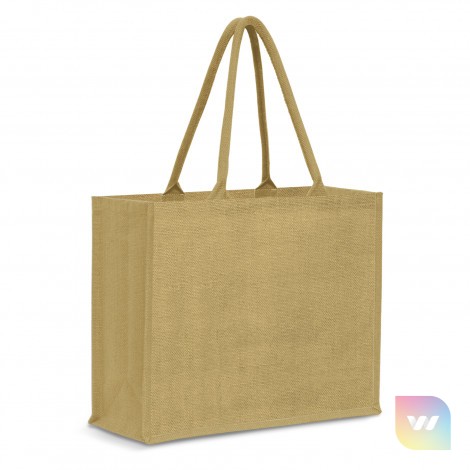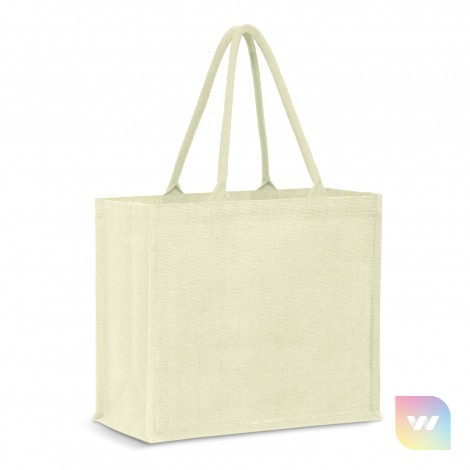 Extra-large laminated jute tote bag with a gusset and padded cotton handles. The bag and handles have been dyed to match.