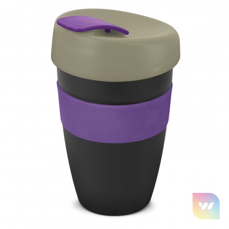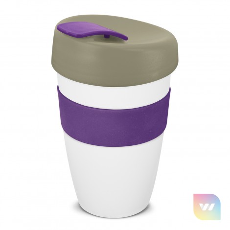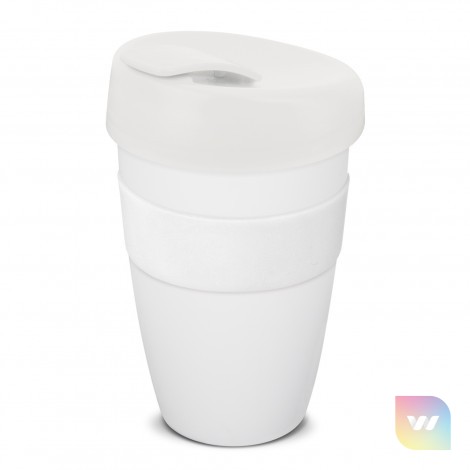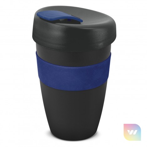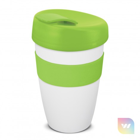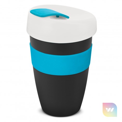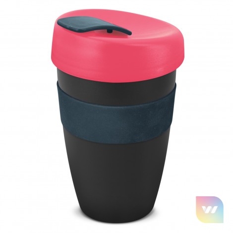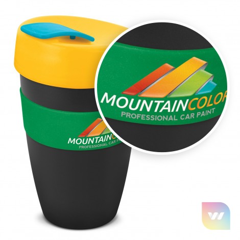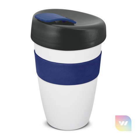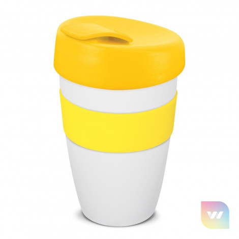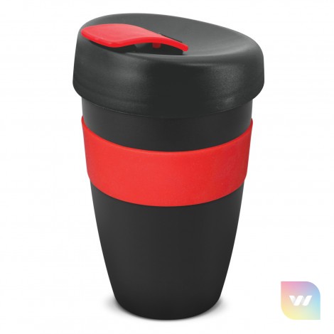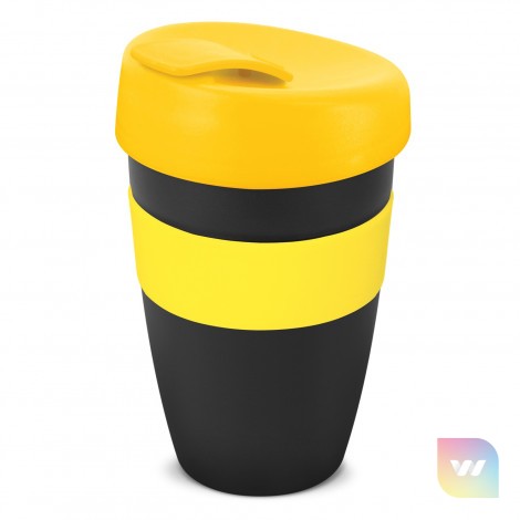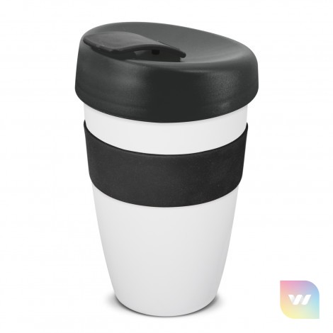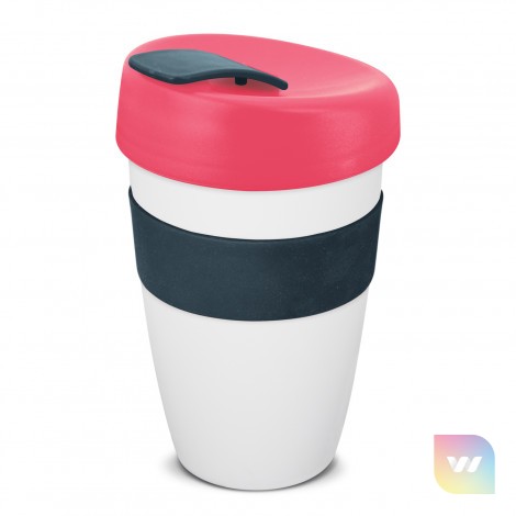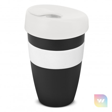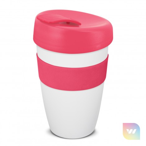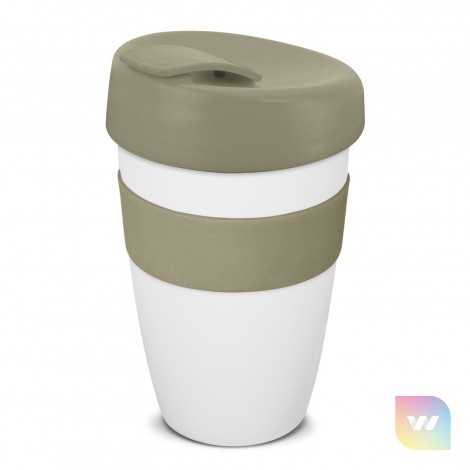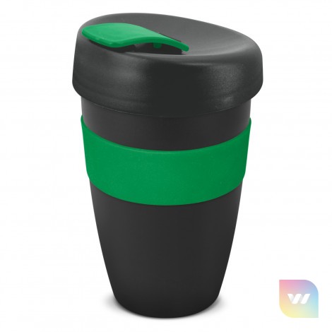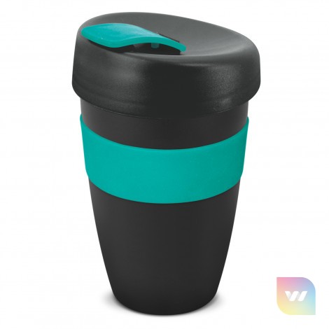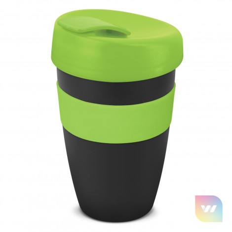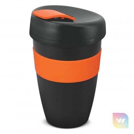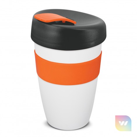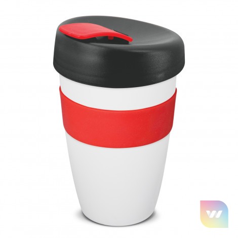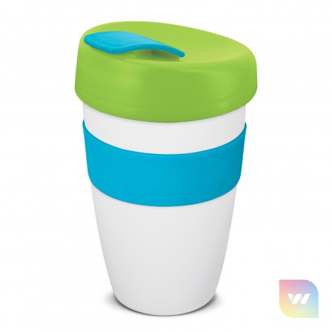 Large 480ml reusable coffee cup with a heat-resistant silicone band and a secure screw on lid with a splashproof flip closure. It is manufactured from polypropylene which is shatterproof, odour-resistant and BPA-free. The cup, lid, flip closure and silicone band can be mixed and matched in any colour combination from the standard colours at no extra cost. Up to five different colour combinations are included in the price and more are available for an additional charge. An optional natural gift box is available on request. This product is not dishwasher safe and handwashing is recommended. Express Cup Deluxe is protected under New Zealand Design Registration No. 419451 and Australian Design Registration No. 361937.