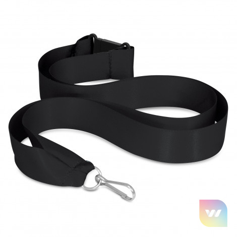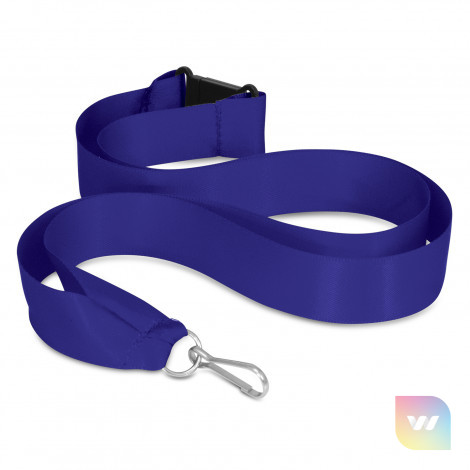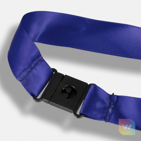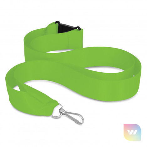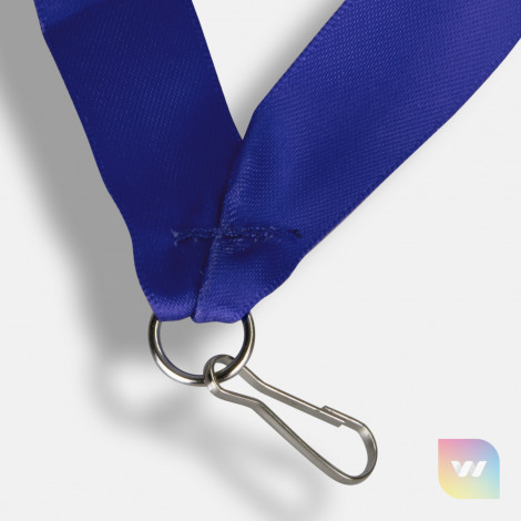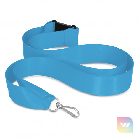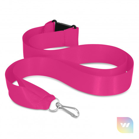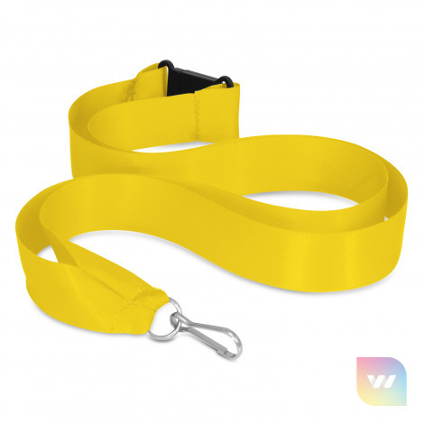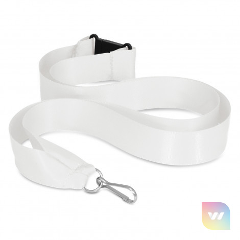 20mm wide ribbon lanyard with a metal ring, a clip and a breakaway safety clip. It can be printed in one colour on one side.