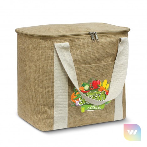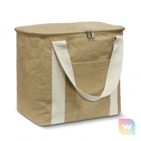 Large 19L cooler bag with PE foam insulation encased in a water-resistant PEVA inner liner. The outer construction is an on-trend combination of natural jute partnered with natural cotton carry handles. Other features include a zippered top closure and a jute slip pocket on the front.