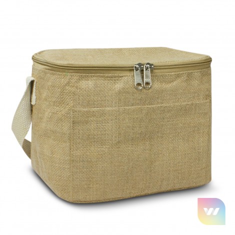 Small 5L cooler bag with PE foam insulation encased in a water-resistant PEVA inner liner. The outer construction is an on-trend combination of natural jute partnered with a natural unbleached cotton carry handle. Other features include a natural zippered top closure and a jute slip pocket on the front.