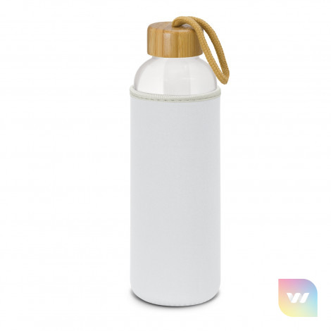 Sophisticated 600ml borosilicate glass drink bottle which features an insulating soft neoprene sleeve that helps to keep drinks cool. Both the sleeve and base can be branded in stunning full colour. Eden has an on-trend bamboo lid with a matching braided carry handle and matching binding in the sleeve. Borosilicate is a lightweight glass which is exceptionally strong and shatter-resistant. Glass is a natural choice for a clean, pure taste and is a safe and reusable plastic alternative. A production lead time of 25 working days applies to the sleeve. This product is not dishwasher safe and handwashing is recommended.
