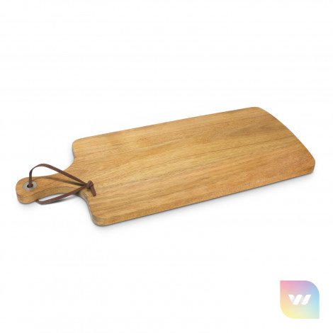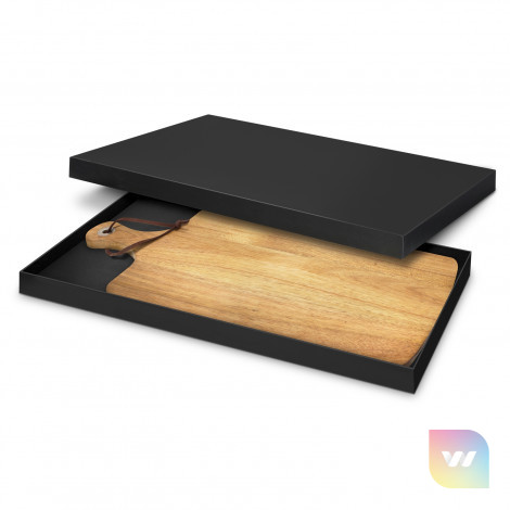 Stylish serving board which is manufactured from acacia wood. The handle has a stainless steel rivet with a leather strap which can be used for hanging the board up when not in use. The serving board laser engraves to a natural etch and is beautifully presented in a matte black gift box. Wood is a natural material which produces unavoidable variances in the grain pattern, colour and branding.