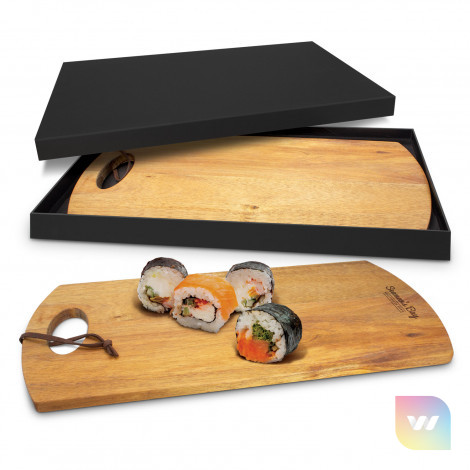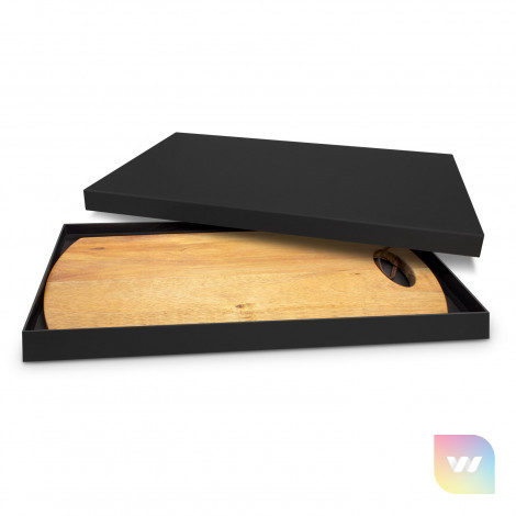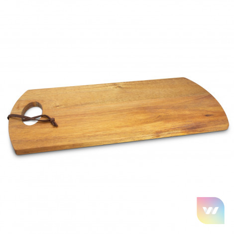 Smart serving board which is manufactured from acacia wood. It has a leather strap which can be used for hanging the board up when not in use. The serving board laser engraves to a natural etch and is beautifully presented in a matt black gift box. Wood is a natural material which produces unavoidable variances in the grain pattern, colour and branding.