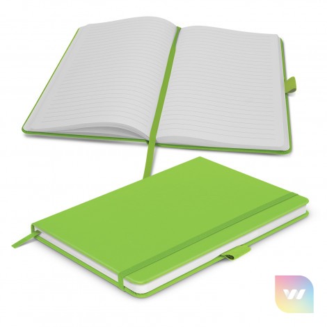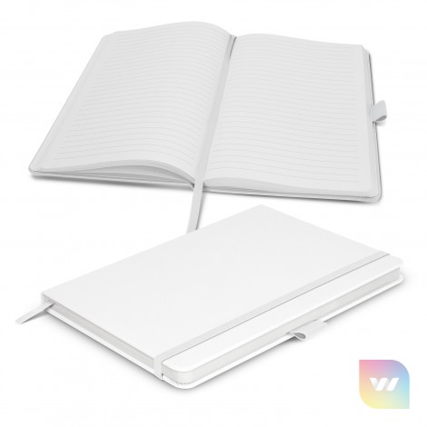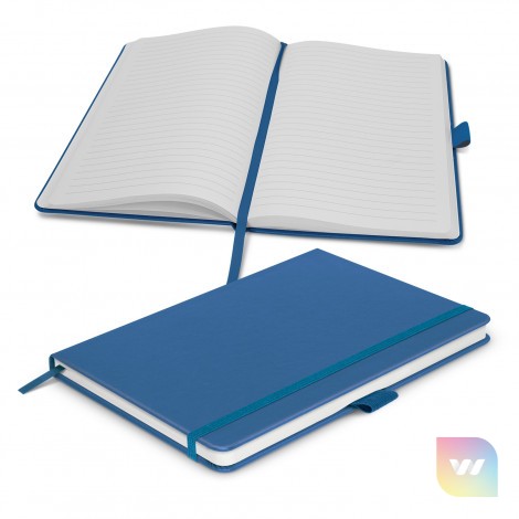 Medium-size (approximately A5) notebook which has a hard cover with a smart PU finish. It has 80 leaves (160 pages) of 70gsm lined paper, a bookmark ribbon, an elastic closure band and an elastic pen loop. An optional paper belly band is available on request and can be branded in full colour.