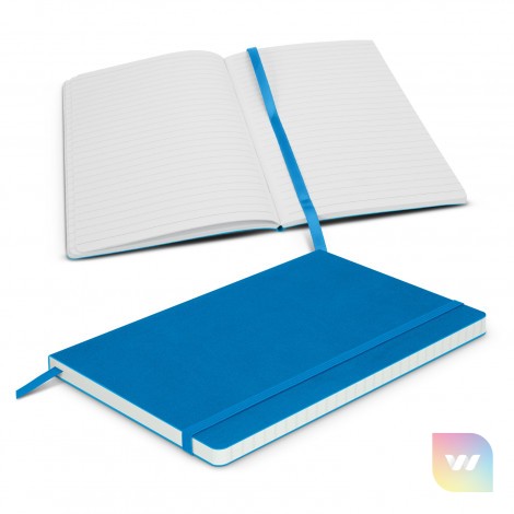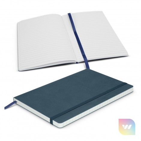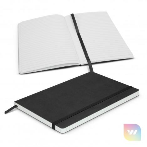 Affordable medium-size (approximately A5) notebook with a soft PU cover which thermo debosses to a stunning two-tone finish. It has 80 leaves (160 pages) of 70gsm lined paper, a bookmark ribbon and an elastic closure band.